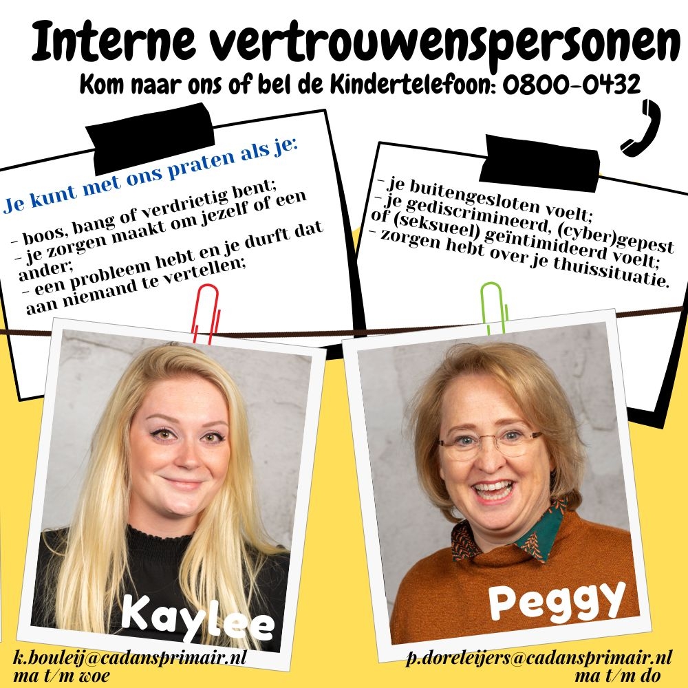 De interne vertrouwenspersonen van onze school zijn Peggy Doreleijers en Kaylee Bouleij. Ouders, leerlingen en collega’s kunnen met eerdergenoemde personen contact opnemen via p.doreleijers@cadansprimair.nl of k.bouleij@cadansprimair.nl. Uiteraard kun je ook naar school bellen of binnenlopen. Peggy is op school aanwezig van maandag t/m vrijdag en Kaylee van dinsdag t/m vrijdag.